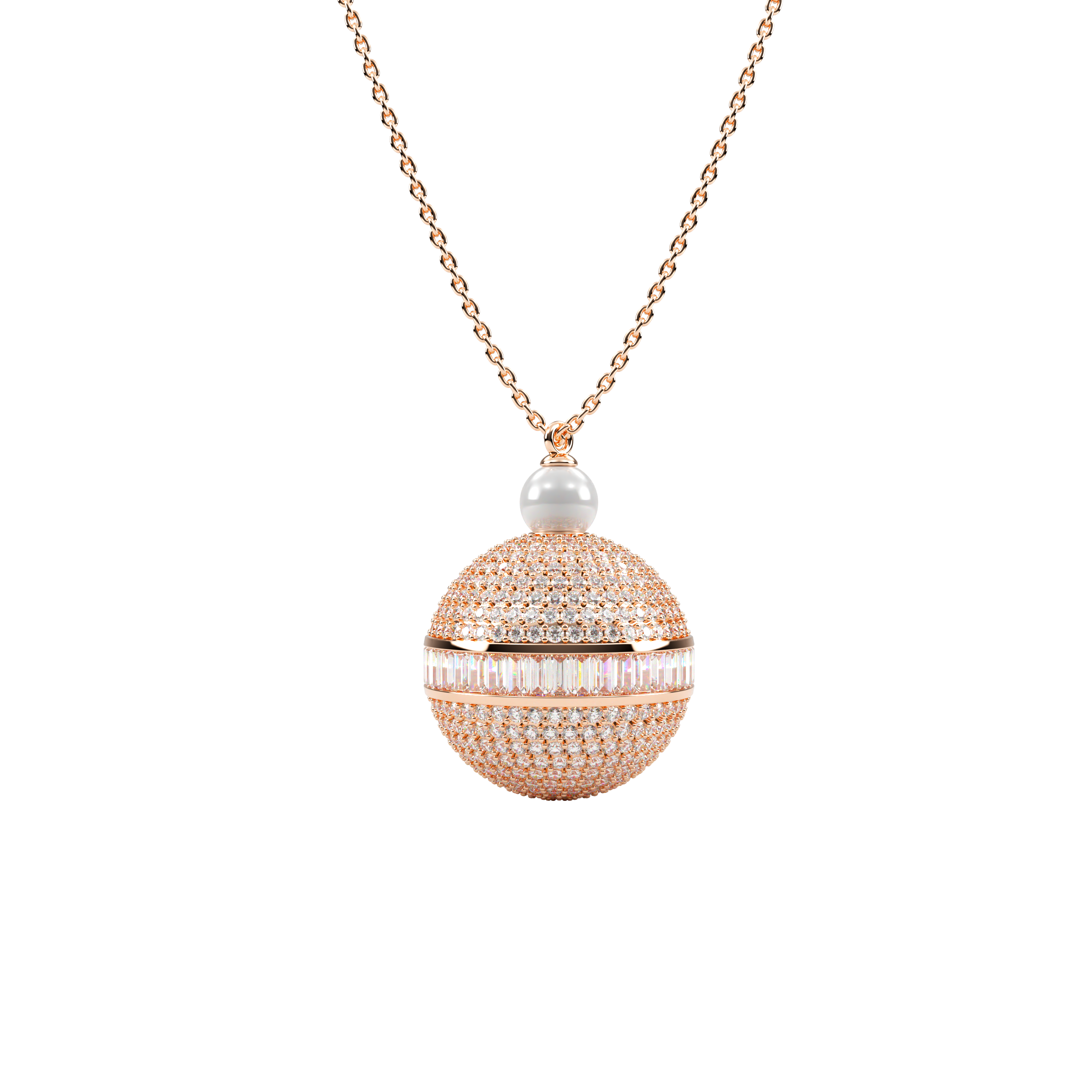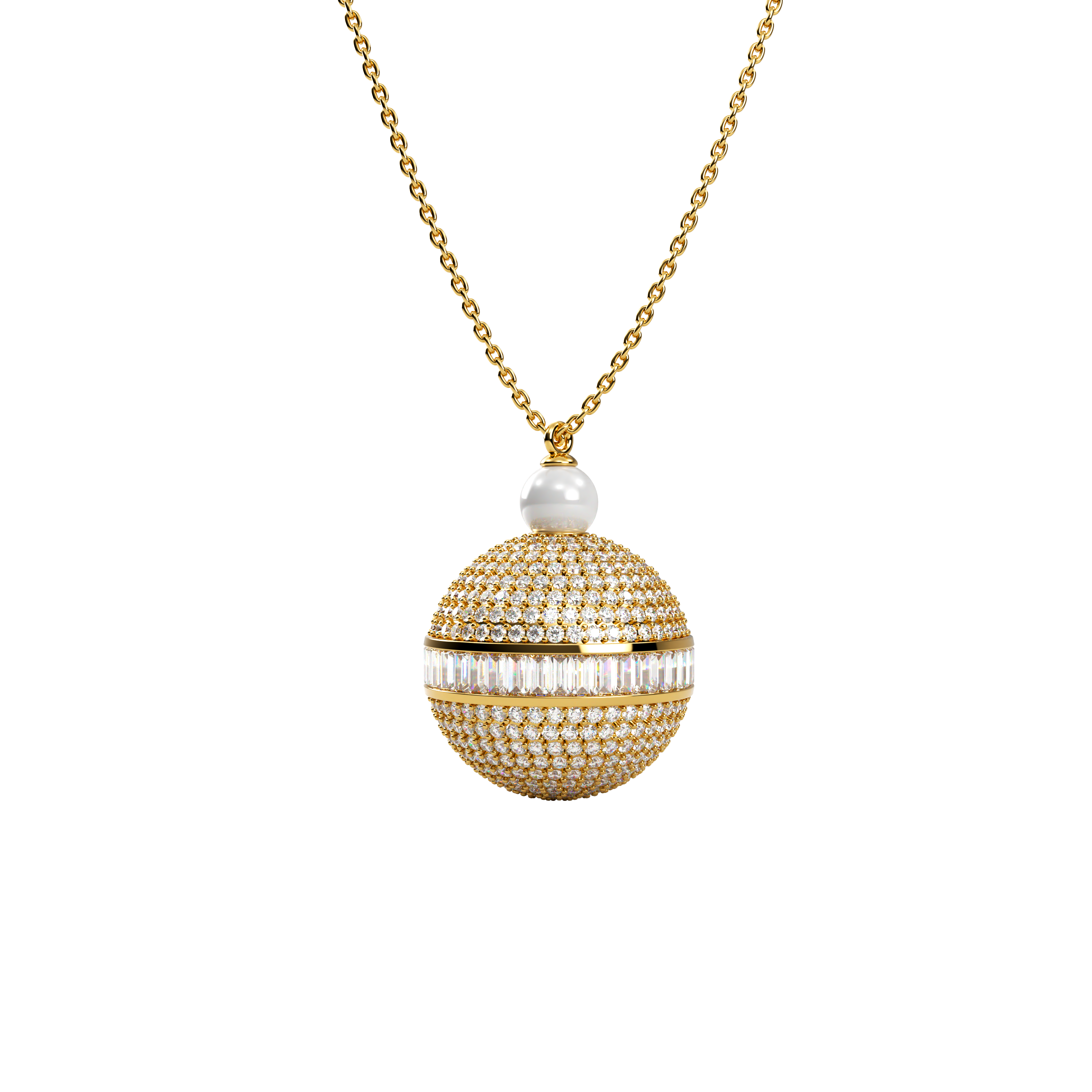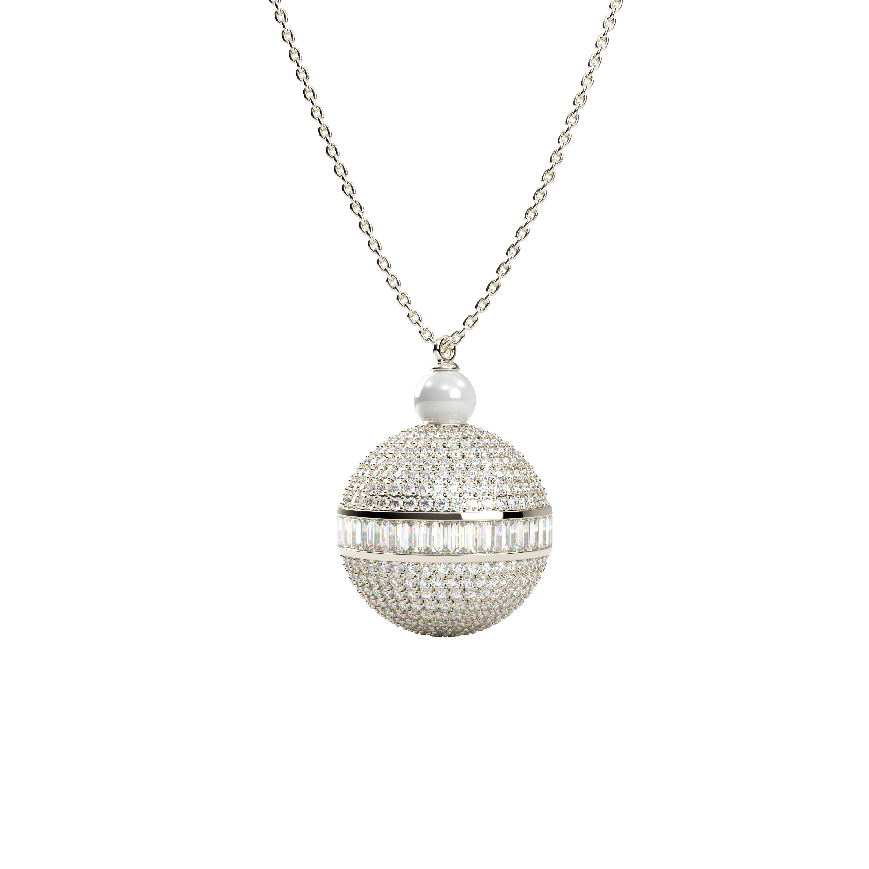 (Name), a circle pendant with pave-set diamonds, resulting in a maximum sparkle combined with round-cut diamonds and emerald-cut diamonds elevated to a white pearl.