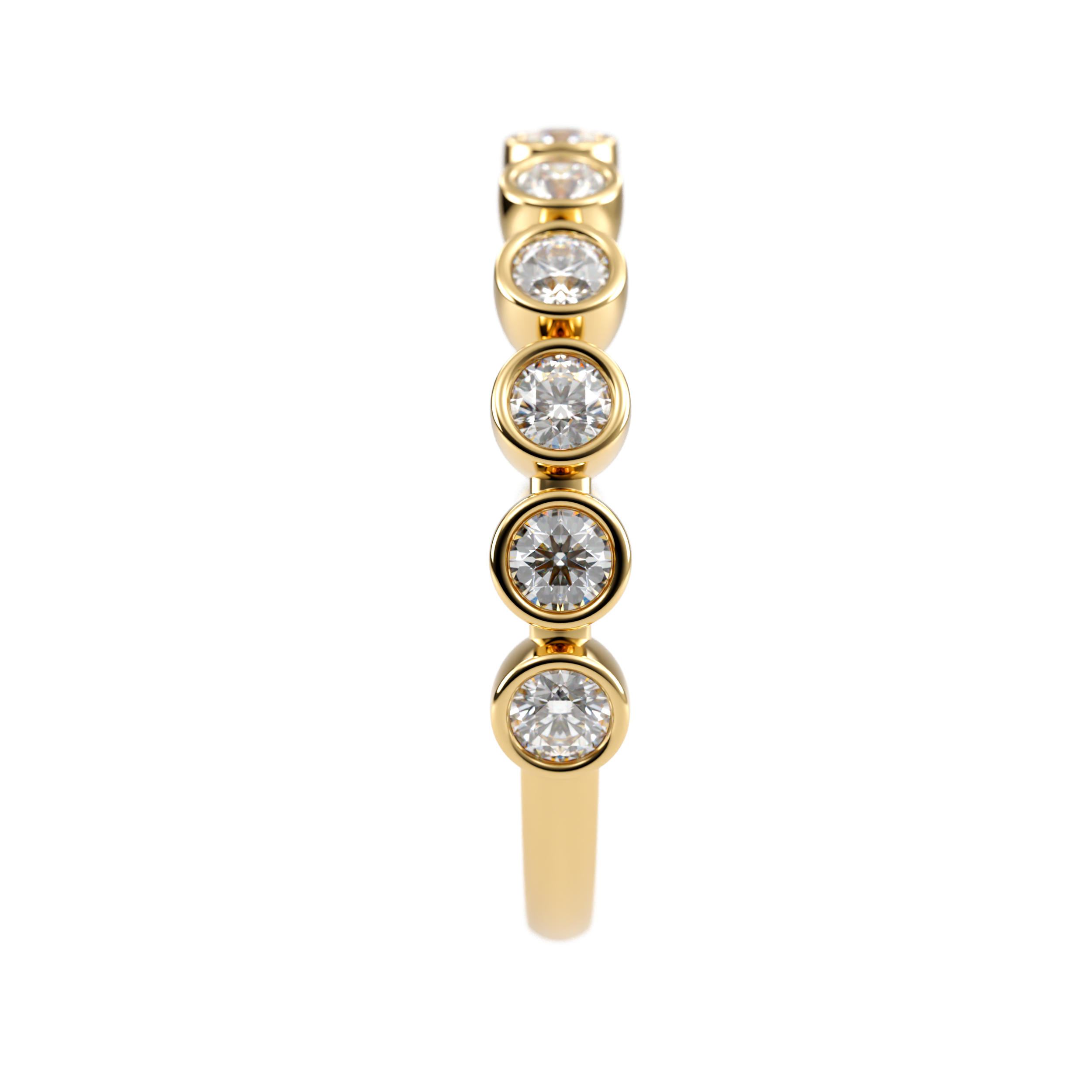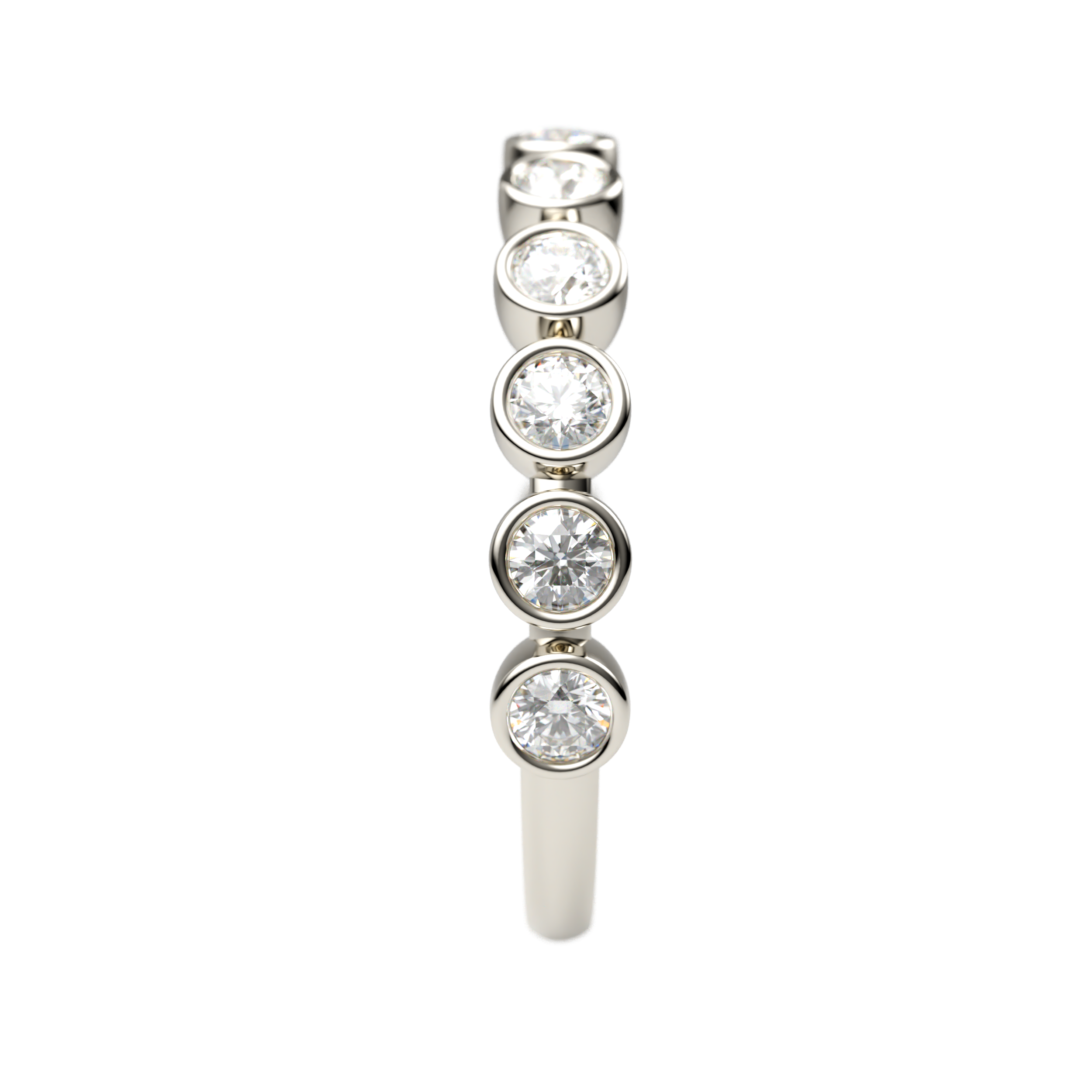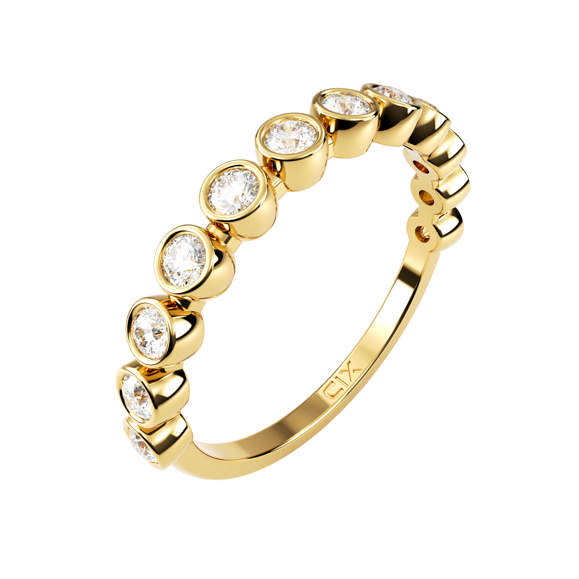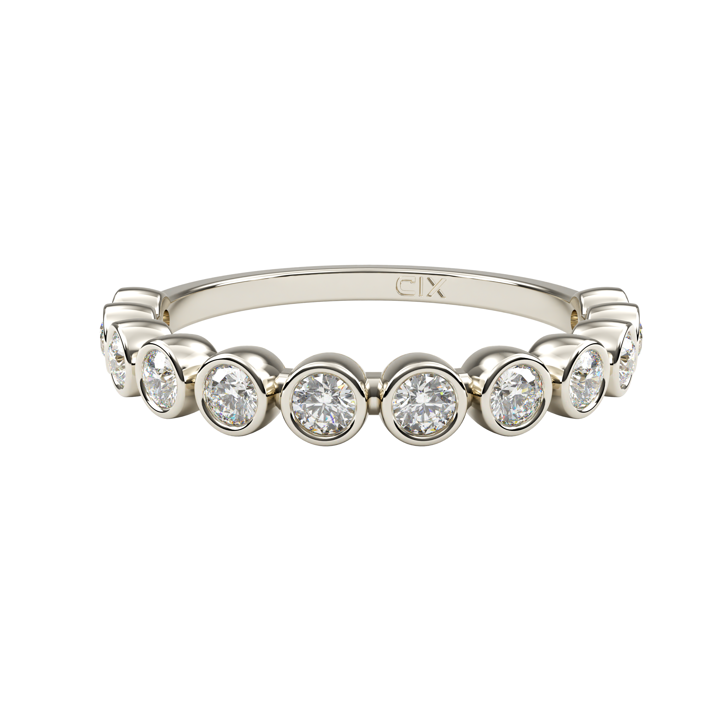 (Name), band ring with a half-circle of brilliant round diamonds, available in 14k Rose, White, and Yellow Gold.