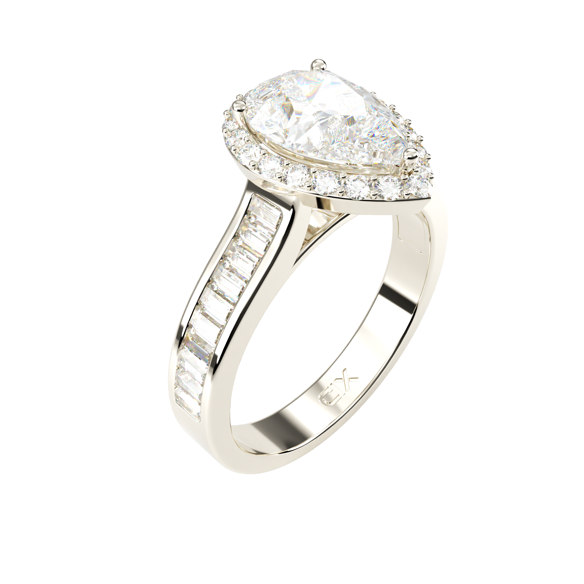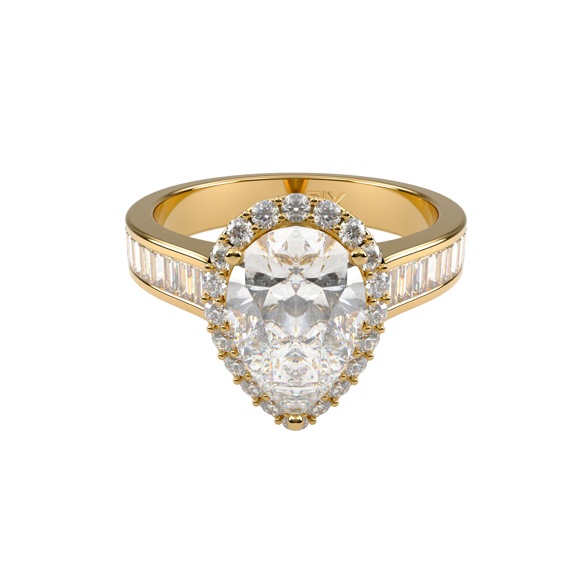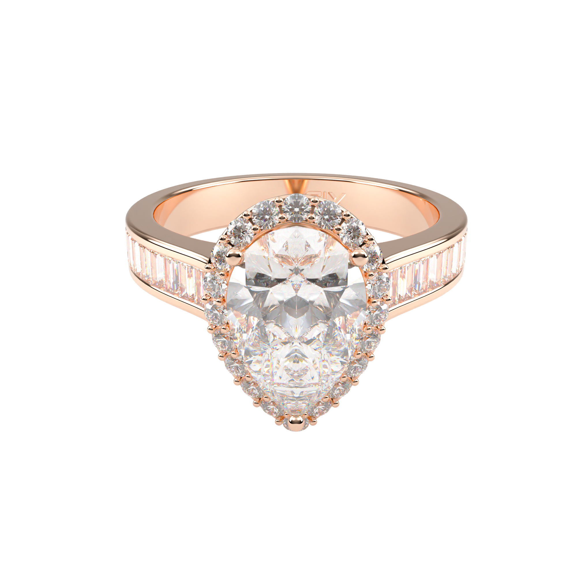 Nassau ring with a gleaming aurora of brilliant paved-set diamonds and a striking pear-shaped center stone; the light is reflected and defined throughout the design. This unique hybrid of the pear shape combined with the brilliant marquise cuts to form a tapering teardrop is available in 14k Rose, White, and Yellow Gold.