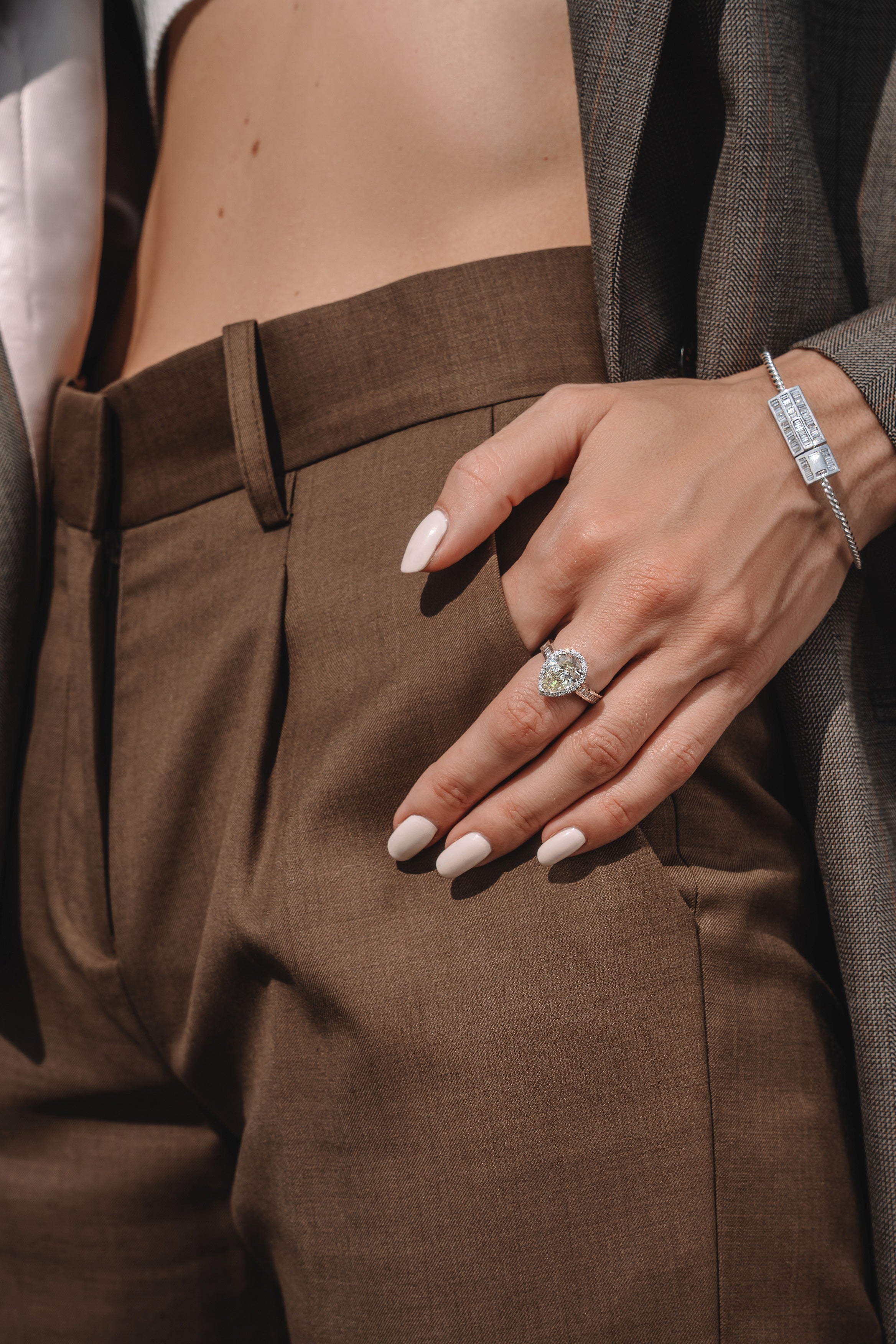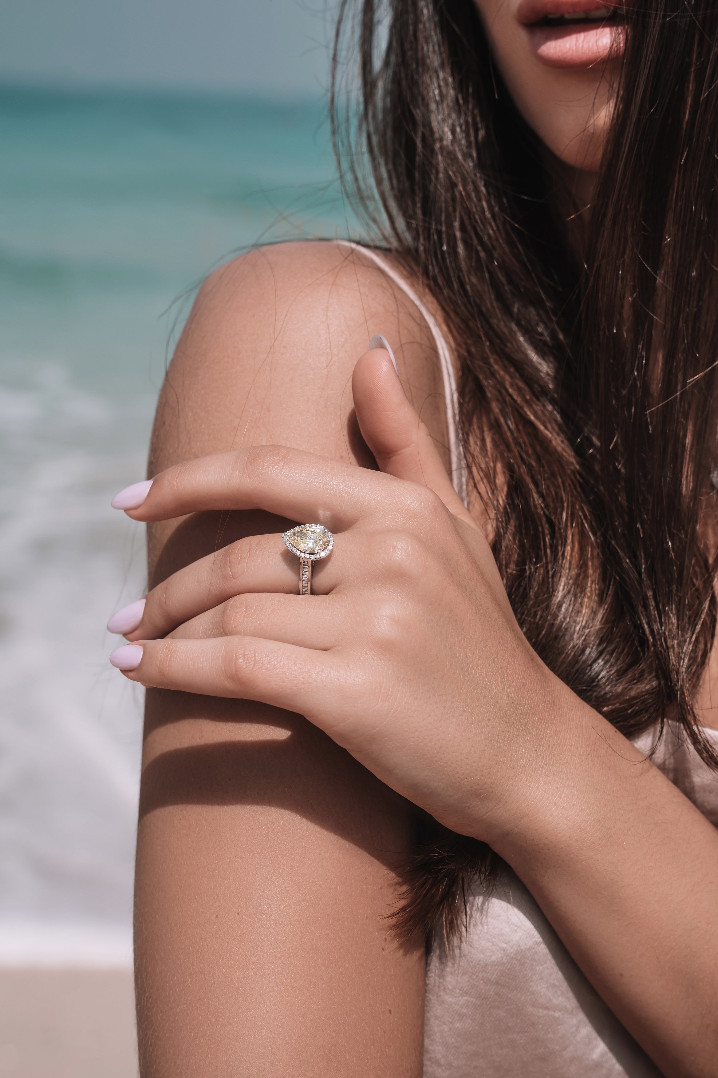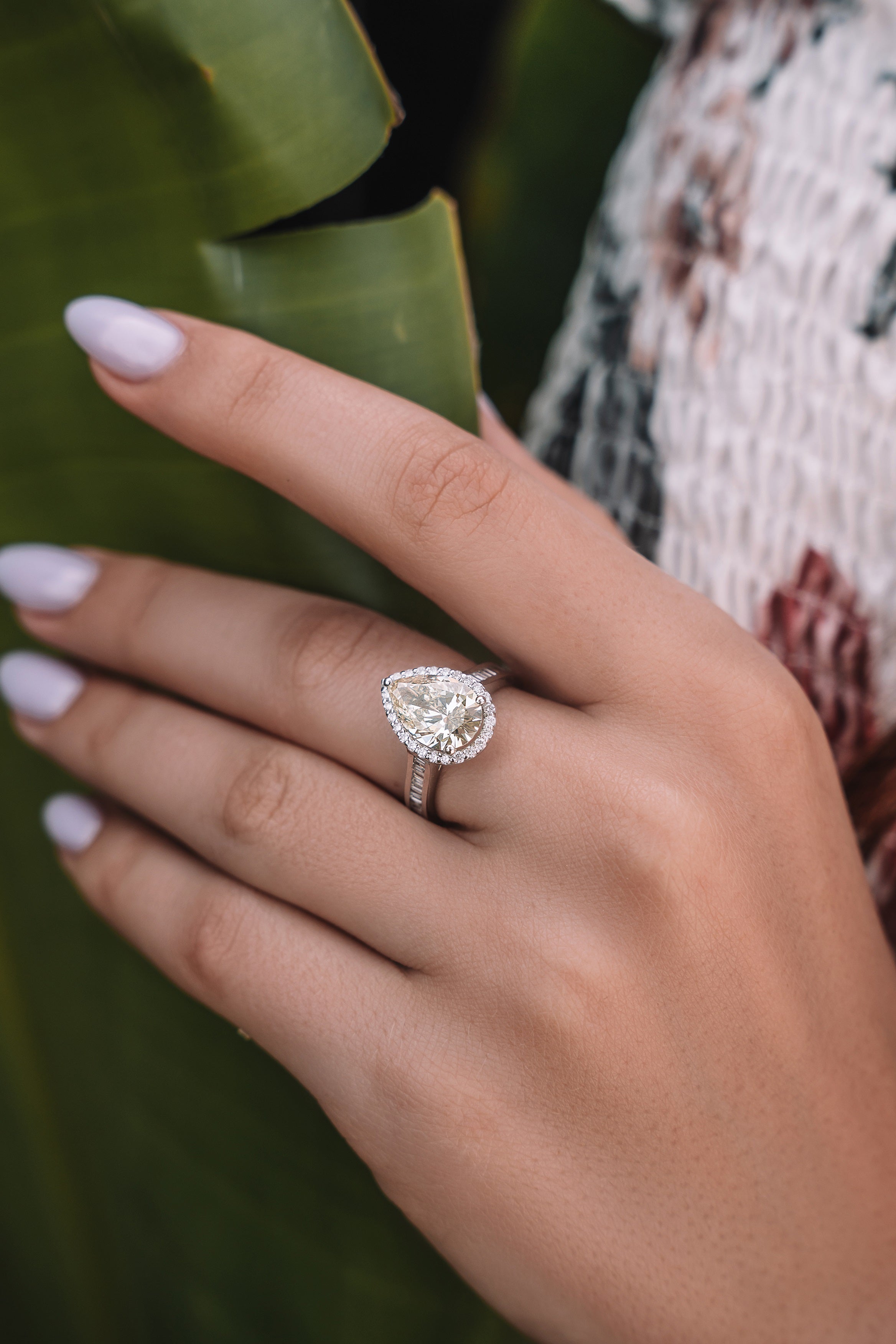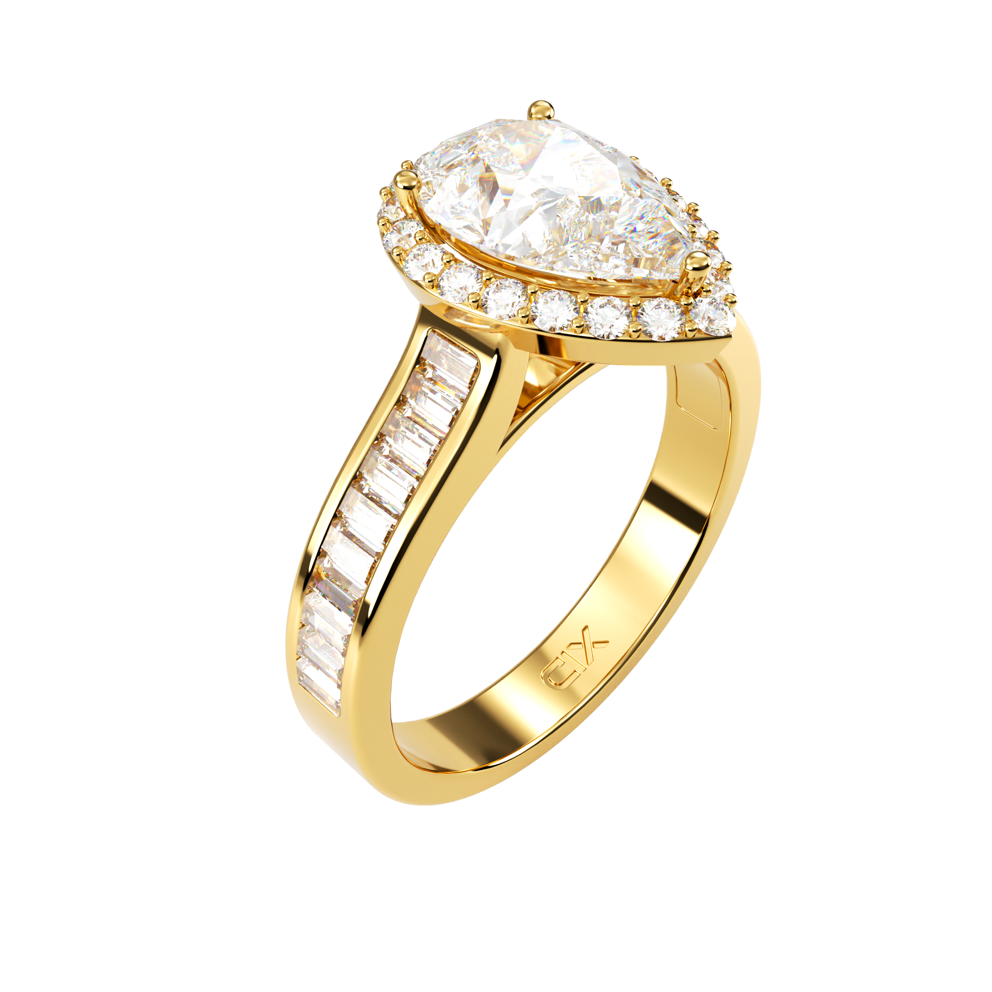 Nassau ring with a gleaming aurora of brilliant paved-set diamonds and a striking pear-shaped center stone; the light is reflected and defined throughout the design. This unique hybrid of the pear shape combined with the brilliant marquise cuts to form a tapering teardrop is available in 14k Rose, White, and Yellow Gold.